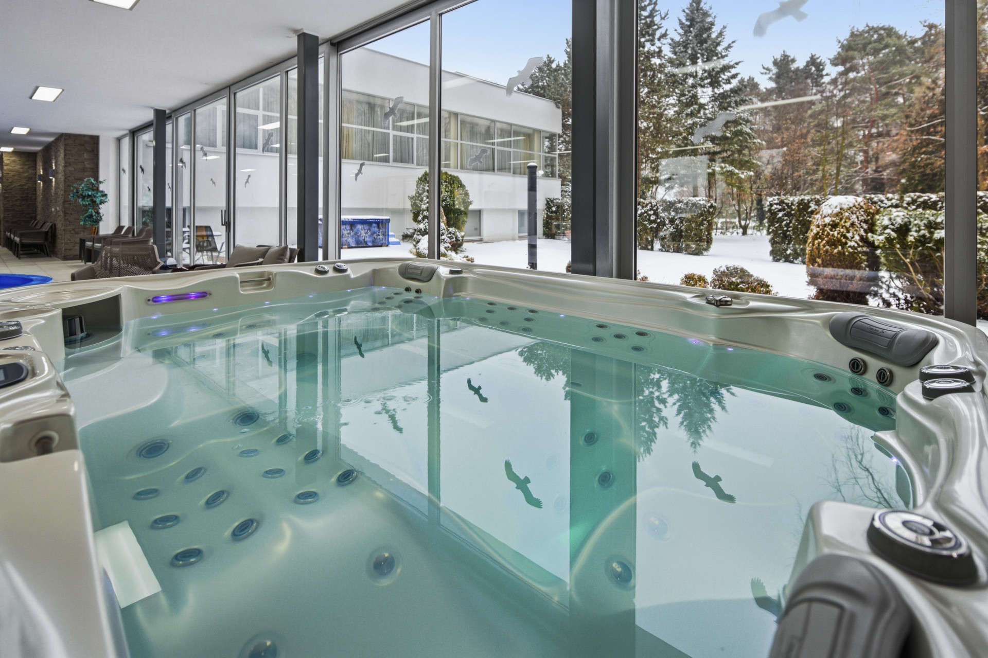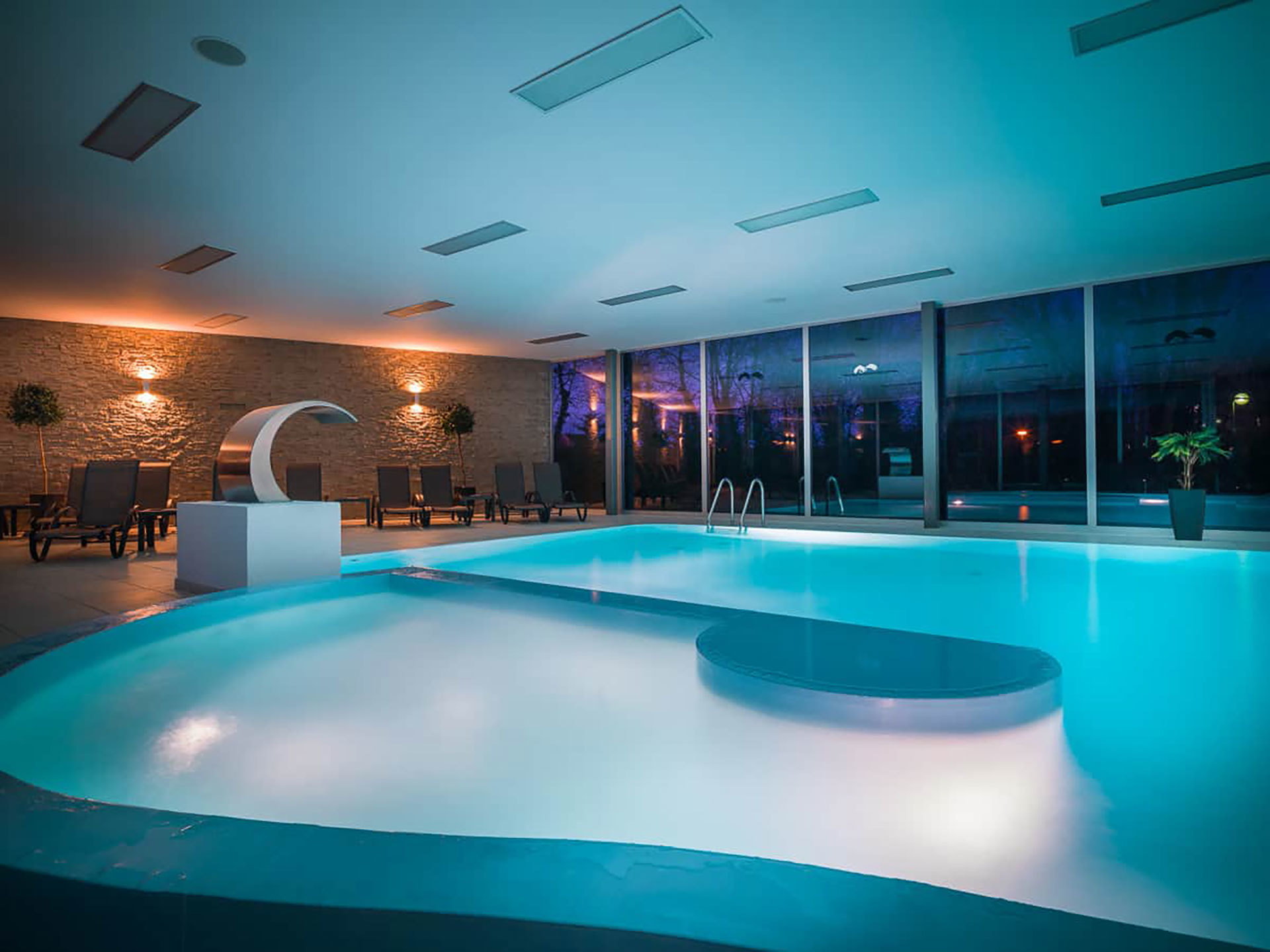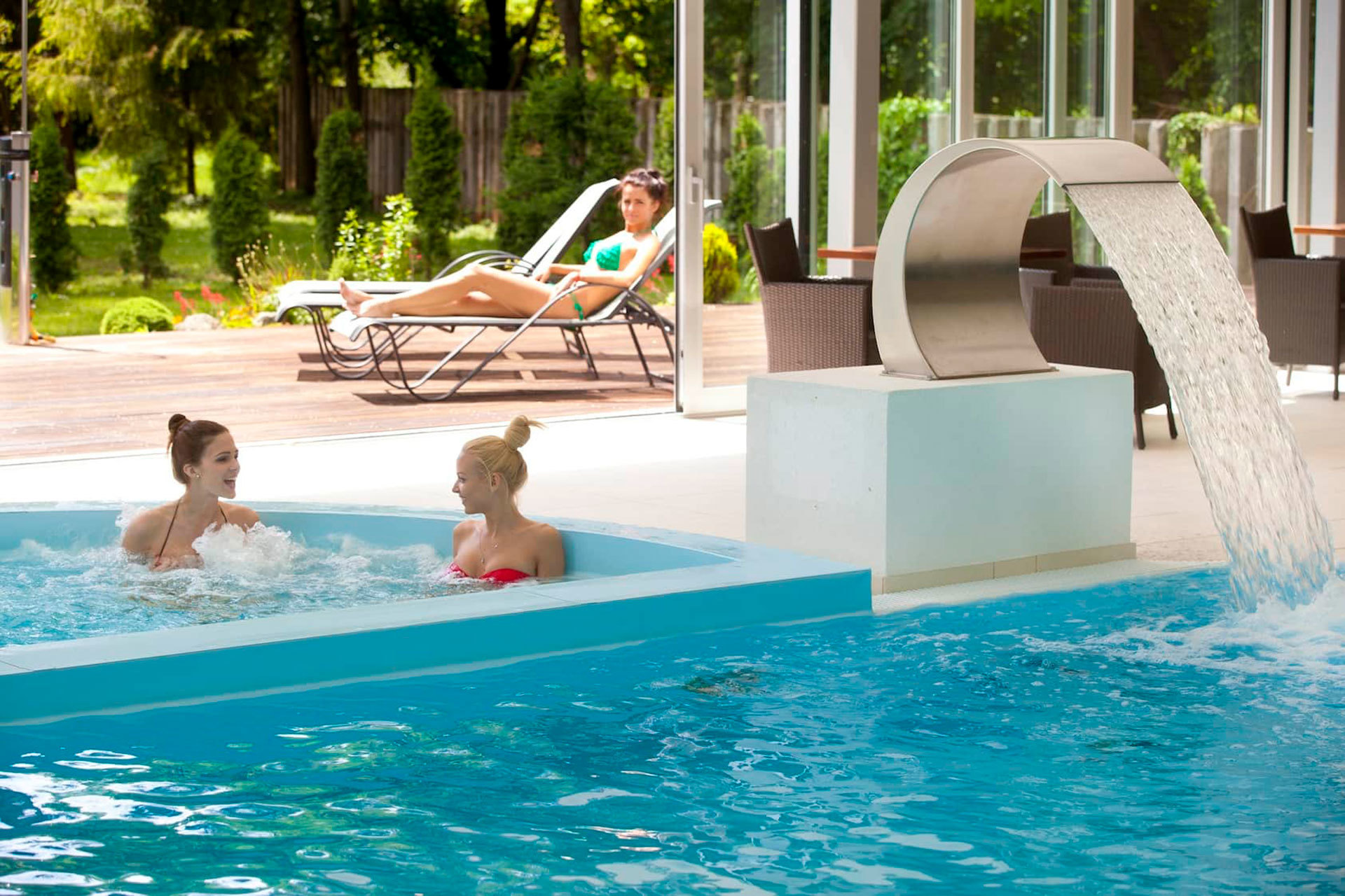 Liegestühle bieten einen bequemen Platz zum Entspannen direkt im Wasser, wo die Gäste sanfte Sprudelmassagen genießen können. Darüber hinaus sorgt ein Wasserfall für eine entspannte Atmosphäre und eine sanfte Nacken- und Schultermassage.