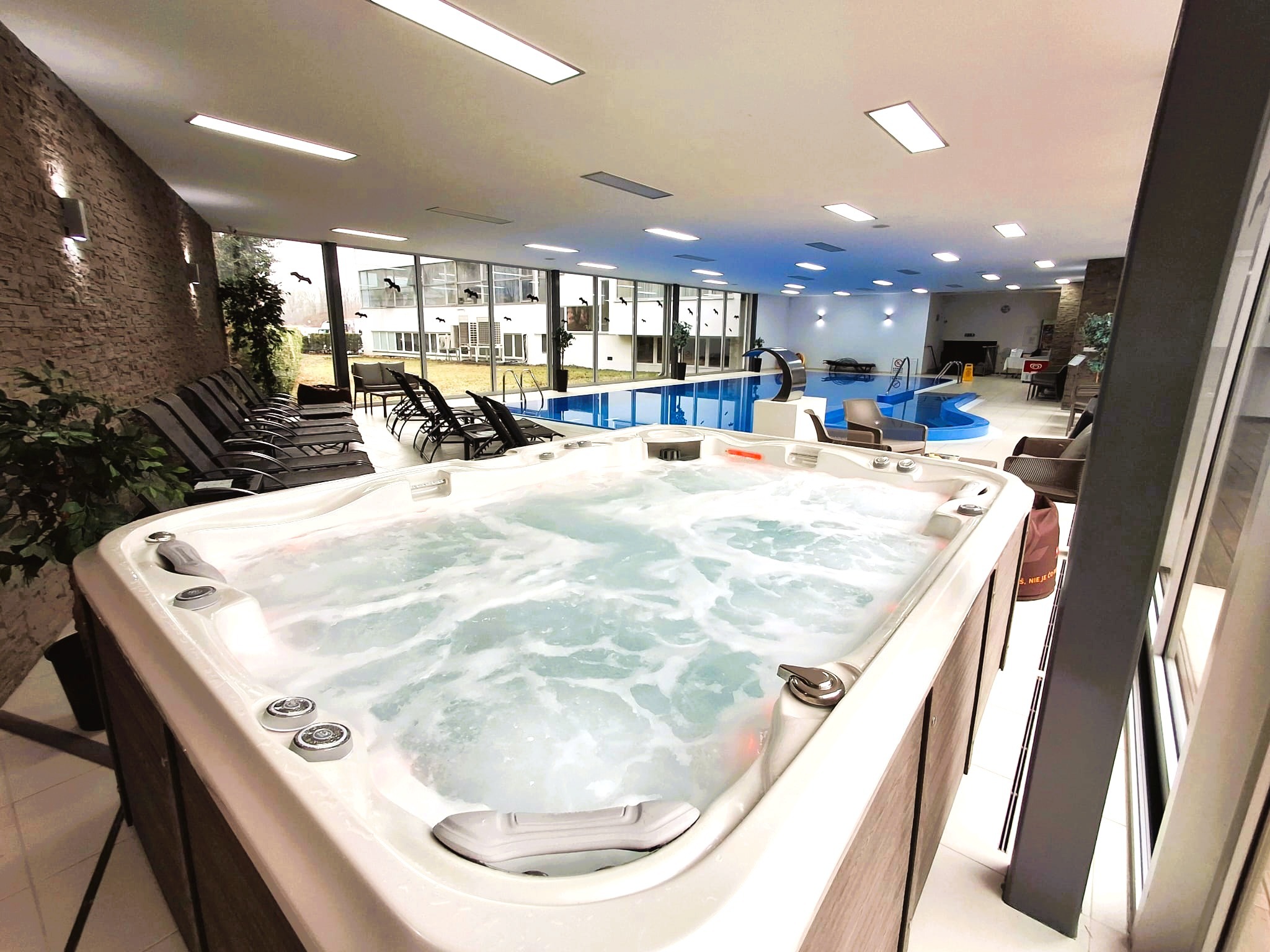 Ein unverzichtbarer Bestandteil des Pools ist auch der moderne Whirlpool, der tiefe Entspannung und Erholung für den ganzen Körper bietet. Das warme Wasser in Kombination mit den Massagejets hilft, Stress abzubauen, die Durchblutung zu verbessern und die Muskelregeneration zu fördern. Der Whirlpool ist der ideale Ort, um sich nach dem Schwimmen zu erholen oder als eigenständiges Entspannungserlebnis, das Ihren Aufenthalt auf ein noch höheres Maß an Komfort hebt.