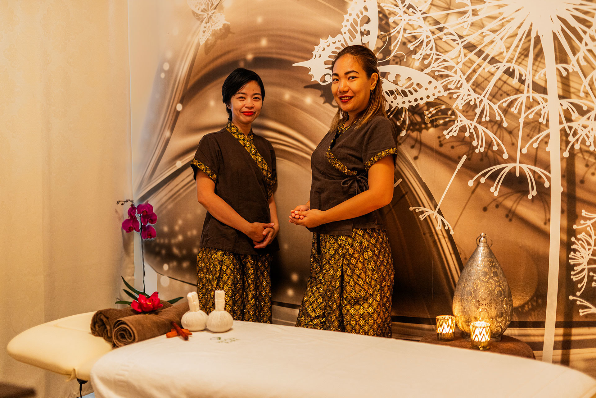 Je metóda, ktorej história siaha až do r. 2 500 p.n.l. Nie je to iba masírovanie svalov a kĺbov, ale práca s desiatimi thajskými masážnymi dráhami, čiže energetickými dráhami, ktoré spájajú akupresúrne body. Stimuláciou týchto bodov sa obnovuje narušený tok vnútornej energie v tele. Ovplyvňuje sa cirkulácia krvi a lymfy, čím sa odstraňujú toxíny z telového tkaniva a liečia sa aj choré orgány a žľazy. Thajská masáž prináša klientovi nabudenie energie, osvieženie a celkovú psychickú rovnováhu. Táto metóda sa robí tlakom prstov, dlaní a lakťov za použitia masážneho pomarančového oleja. Procedúra trvá 40 minút.